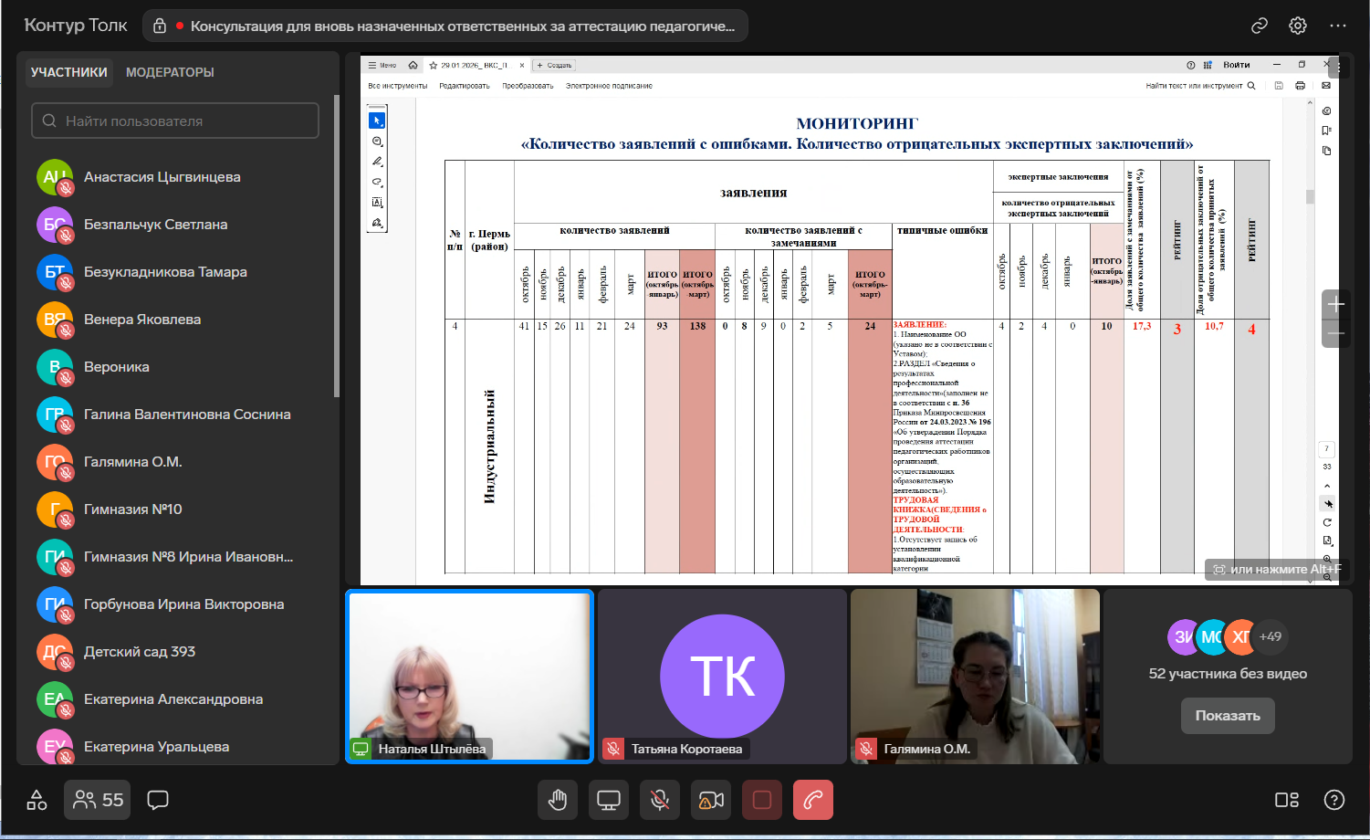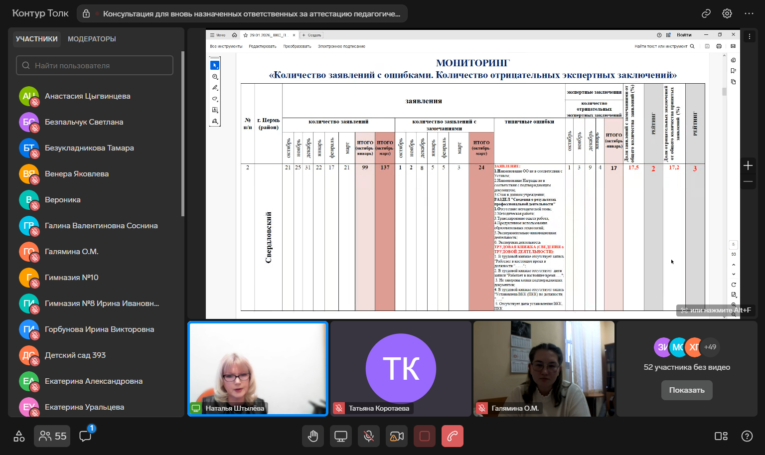 В совещании приняли участие заместители директоров, методисты, специалисты, ответственные за аттестацию педагогических работников из 44 государственных и частных образовательных организаций Пермского края. Количество участников - 51 человек.